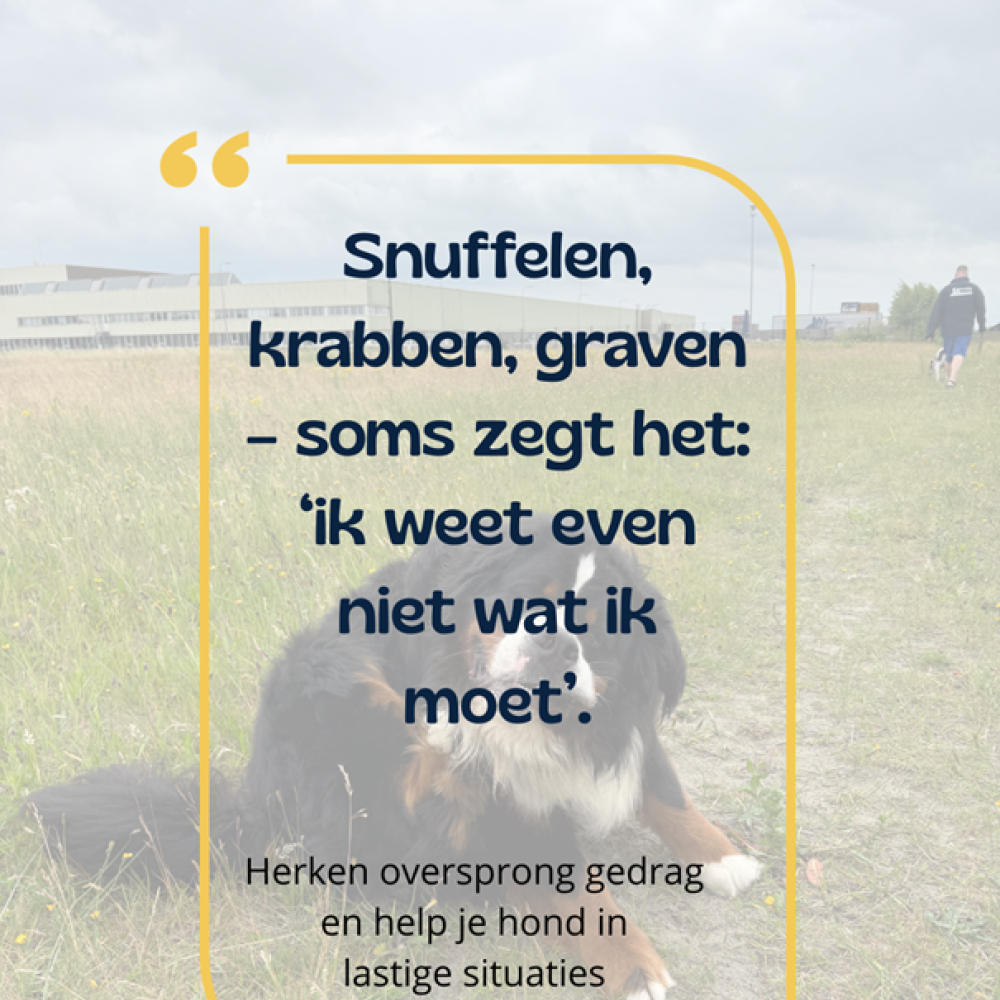 Voor ons ziet het er soms gek uit. Alsof de hond ineens iets doet wat totaal niks met de situatie te maken heeft. Maar juist dรกt gedrag is belangrijk: het vertelt je dat hij zโn best doet om met de situatie om te gaan.